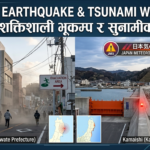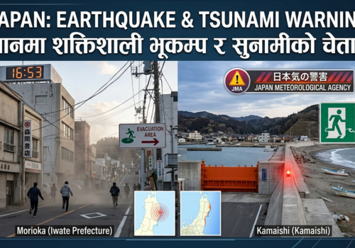 टोकियो, २० अप्रिल २०२६/ जापानको उत्तर-पूर्वी क्षेत्रमा आज दिउँसो ७.७ म्याग्निच्युडको शक्तिशाली भूकम्प गएको छ। भूकम्पपछि जापान मौसम विज्ञान एजेन्सी (JMA) ले प्रशान्त महासागरीय तटीय क्षेत्रहरूमा ३ मिटर (१० फिट) सम्मको सुनामी आउन सक्ने भन्दै चेतावनी जारी गरेको छ। मुख्य विवरणहरू: भूकम्पको समय: स्थानीय समय अनुसार आज दिउँसो ४:५३ बजे। केन्द्रविन्दु: इवाते (Iwate) प्रान्तको तटीय... विस्तृतमा